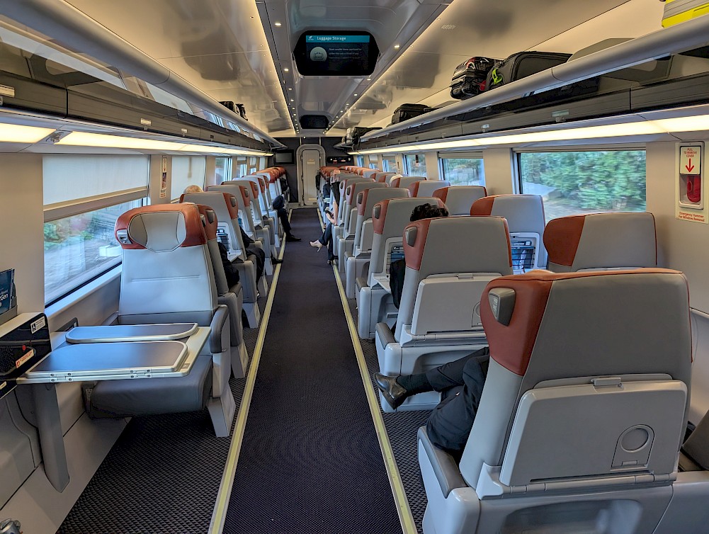 The last thing to address, and I know this will be a controversial one: the recline. I found it plenty generous in business (though I didn’t measure specifically) and can’t report on first, since I didn’t actually sit there. But unlike the first-gen Acela seats, where you tilt your seatback back, these recline by sliding the seat bottom forward, like the Talgos that ran on the Cascades route 20 years ago. I don’t mind this style of recline, and in fact I prefer it: as someone who travels with a laptop and tries to get work done, I can tell you that even where the legroom is generous, it can be challenging when the seat in front of you angles into your space and gets in the way of your laptop screen. But I get that there are people who would rather have “true” recline. As with all things, it’s a trade off. The upside is that the person in front of you can no longer “lean in” to your space.