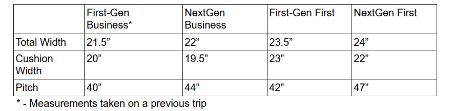 I’ll start with the width, where you can see there’s a bit of a trade-off. While the total seat width (measured from armrest to the center point between the seats) was slightly more generous on the NextGen trainsets in both business and first, the actual width of the cushion under you was a bit smaller in both cases: by half an inch in business and by a full inch in first, though it’s still a generous 22” in first.