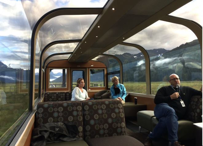 Even excellent glass-sided lounge cars (here I'm thinking about the beautiful Alaska Railroad Gold Star service cars) still anchor the passenger at window height. On the other hand, domes change three things simultaneously. Domes change sightlines, so that passengers see over vegetation, fences, berms, and freight consists. Domes change orientation, so passengers perceive the curvature of terrain and sky continuity. And domes mean shared attention. Everyone faces outward and upward together, which subtly encourages conversation in a way traditional forward-facing window seating does not.