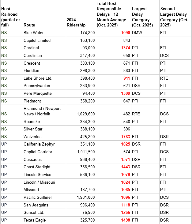 Below, we’ve compiled Amtrak ridership and OTP data for affected routes.